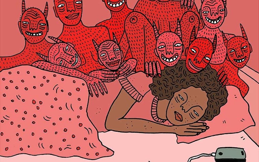 Now, she makes work that is not only a reflection of her inner self but the average, modern-day woman. Nor's pieces typically depict (naked) women in their most natural state, doing ordinary things such as lounging, smoking, taking mirror selfies, and masturbating. The devil is present for all of these activities, having a deeper meaning than you might initially think (more on that later).