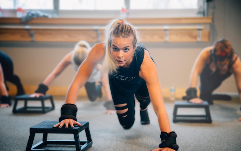 The first difference Pure Barre acolytes will notice is that you don't need a red ball or tubes; instead, you'll grab a platform, cuff weights, and light dumbbells. The class also starts on the floor instead of standing up, high-knee lifts replaced with immediate planks, squats, and push-ups using the platform box and weights strapped on your wrists. The beginning is intense and "sets the focus for the rest of the class," the instructors tell you. While the difference may seem subtle in the actual moves—you do very similar core, ab, and arm work as in the beginning of every barre class—the addition of wrist weights (used in addition to dumbbells in the arm portion) and the platform, makes everything just that much harder, though not unbearable.