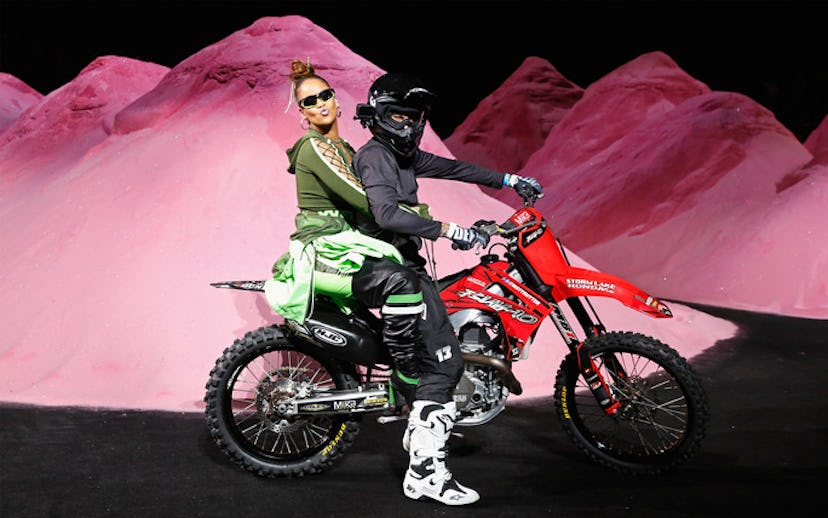 Futuristic pink sand mountains welcomed a sea of fashion editors, celebrities, and fans last night. Ahead of the main event were a trio of motorcyclists, who performed adrenaline-fueled stunts over the dunes. Model Slick Woods arrived on the back of a motocross. Whoopi Goldberg, Cardi B, Migos’ Offset, Ashley Graham, Big Sean, and Jhené Aiko all sat front row. Rihanna’s Fenty x Puma fashion week show was underway.