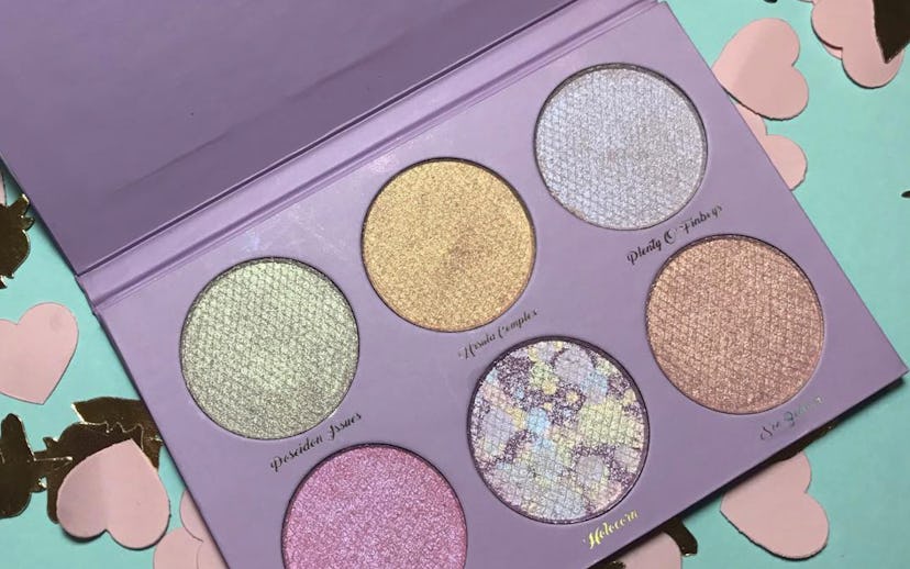 Each kit has six brightly colored highlighters. The top row is dedicated to mermaids, with shimmery shades like "Plenty O' Finboys," an iridescent silver-blue, "Poseidon Issues," a violet that turns mint green in light, and "Ursula Complex," a deep yellowish gold. On the unicorn side, we have "Magical AF," a bubblegum pink with blue and purple highlights, "Holocron," a violet with rainbow tones, and "Non-Believer," a rose gold shade.