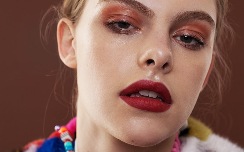 To create these swoon-worthy glossy lids, mix Bobbi Brown lipsticks in Burnt Sugar, Nectar, and Heather Buff.