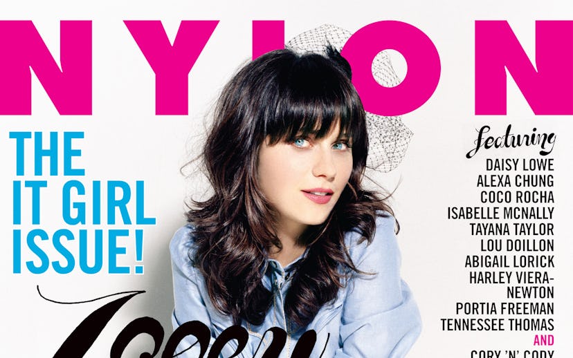 A door slams, and suddenly Zooey Deschanel is rushing towards me, her mouth an "O-shaped" silent apology, her eyes round with concern. "I'm late! And it's loud! It's never loud here!" she exclaims, sliding a canvas tote bag studded with colorful band buttons off of her shoulder and slinging it onto the back of a chair. Our meeting place is the aptly named La Conversation, a small French cafe in West Hollywood just around the corner from iconic rock venue the Troubadour, and yes, it is loud: the room is humming with the crash of cutlery and the din of lunch-diners shouting at one another over quiche. "Is it OK?" Deschanel asks, shooting me another worried glance.