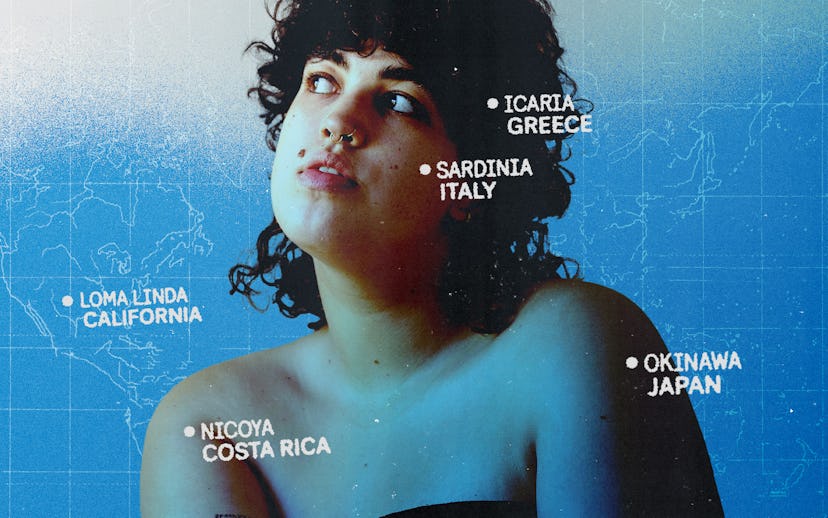 The term “Blue Zone” was coined by Michel Poulain and Giovanni Mario Pes, who studied longevity in Sardinia, to describe the geographic areas of the world with the highest rates of centenarians. There are five Blue Zones where “populations described as the world's healthiest people” live: Ikaria in Greece, Okinawa in Japan, the Ogliastra Region of Sardinia, Loma Linda in California, and the Nicoya Peninsula in Costa Rica. The concept of living a Blue Zone-inspired lifestyle is to create a longer life by living well—generally by embodying holistic health practices like eating a plant-based diet, moving more, reducing stress, and even putting your loved ones first. But on the internet, this idea has been transposed into creator challenges like “eating like 100-year-old people” or documenting the effects of leaving their jobs to live in a Blue Zone for three months.