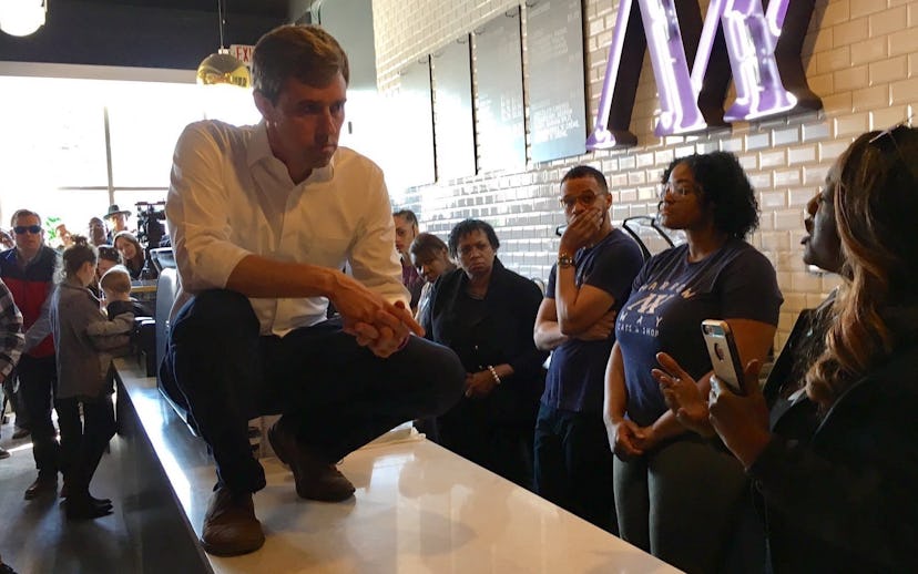 Many Twitter users have pointed out that O'Rourke spends his time at these events perched on bar counters, making his speeches from there or just chilling at a higher altitude than his supporters. There's even a Twitter account dedicated to posting photos of O'Rourke on elevated surfaces. And, after the millionth photo of him seemingly making a home up on a bar counter instead of standing on the ground like a normal person, I had to wonder whether it was a pointed decision.