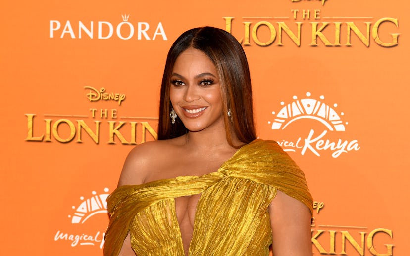 The multi-hyphenate, who was at the ceremony to support her work in Disney's 2019 The Lion King, snuck into The Beverly Hilton ballroom alongside husband Jay-Z wearing a stunning, custom Schiaparelli Haute Couture gown, designed by Daniel Roseberry. With big, structured golden sleeves, fitted black bodice, and plunging squared-off neckline, the look was truly impossible to miss. Unsurprisingly, her glam was just as stunning, with a honey-glazed complexion, neutral glossy lip, and a sleek and simple middle-part, similar to the hairstyle she wore the European premiere of The Lion King.