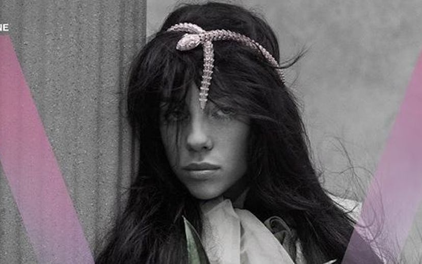 On the cover, Eilish is rocking waist-length hair and a full bang, a serpent Bulgari necklace worn as a headpiece, and a lace-adorned Gucci shirt and cape. Both the beauty and fashion looks are a departure from the singer's usual aesthetic—shoulder-length black hair with occasional lime green roots or blue strands, baggy clothing, extra-long nails—save for the signature smolder. The makeup is minimal in comparison to her usual look—although her bottom lashes are really having a moment—allowing her long hair to take center stage. It's an unexpected look for the singer—and one that showcases the singer's versatility perfectly.