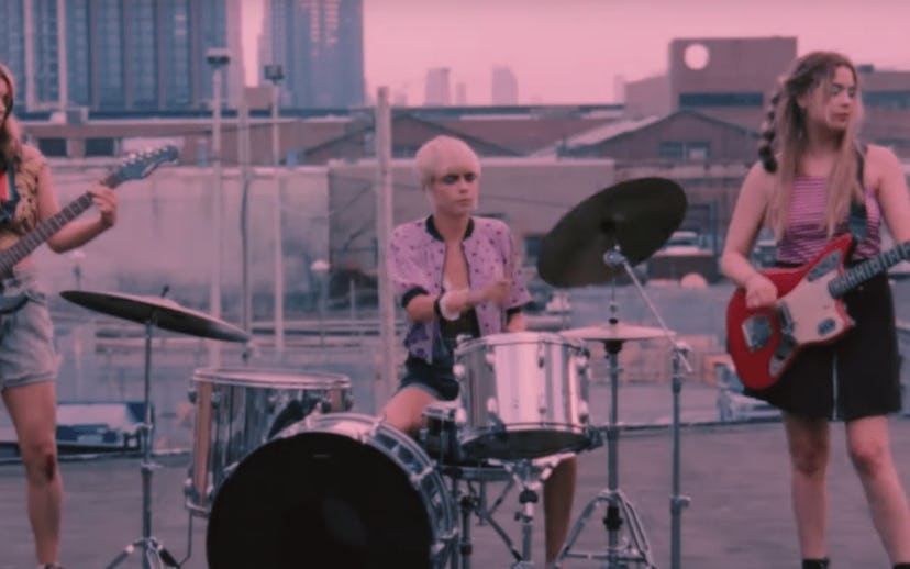 The ladies are seen singing their song "Can't Wait" in '90s grunge-ish attire. Delevingne, with a platinum blonde bowl cut, plays the drums, Benson the guitar, and Gelula the bass. In the film, Akergirls are the up-and-coming girl group that Elisabeth Moss' punk rock character Becky Something helps mentor.