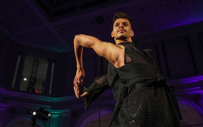 But all credit ultimately goes to dapperQ, who place a high value on queer community-building. "The best thing about showing my work with dapperQ is being surrounded by this beautiful community of queer people, so you already feel this support and energy that everyone is rooting for and cheering for each other to succeed," said Travis Oestreich. "It's such a collective experience and everyone is here to help make this night so memorable and show that queer people are beautiful inside and out." The audience adds to this, too: Every model who came out was cheered on and applauded, especially if they were turning an iconic look.