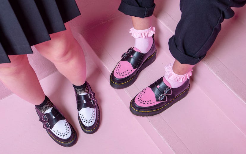 There are classic creepers, with chunky platform soles and double heart buckles, in two colorways: black-and-white and a summery pink-and-black. This pastel pink, in the form of hearts, can also be found on the other two styles: a platform heart-buckle boot and, the most exciting addition to the collab, vegan sandal.