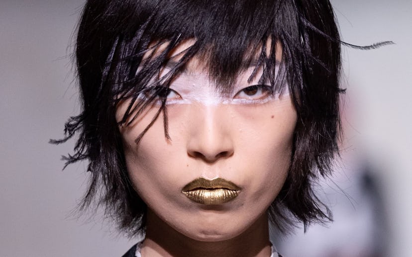 The makeup was an avant-garde take on the painterly trend we've seen popping up on runways, and complemented by curtain-like feather bangs. The bangs, attached underneath the model's hair, ranged from black to blue and hot pink. Metallic lips on some of the models added to the drama of the look.