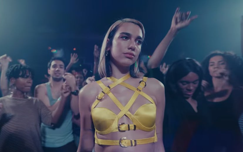 The new era of Dua Lipa is upon us: The singer traded out the monochrome pastel robes and unison choreography found in the "New Rules" video for black lights, neon, and messy glitter with "Don't Start Now." She hasn't traded out everything from the old era, though; "Don't Start Now" was created with "the brilliant same crew I made 'New Rules' with," Dua said in a statement.