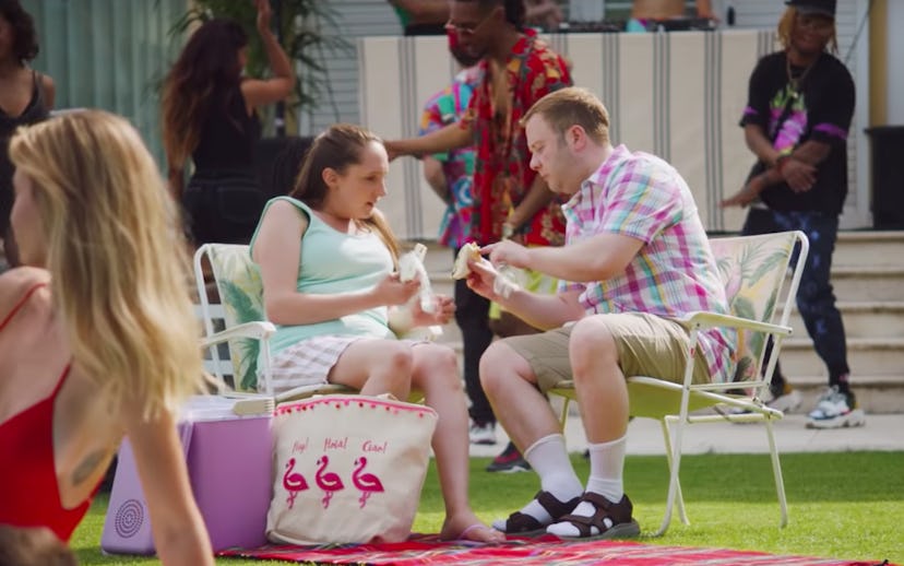 The two unwitting travelers—complete in sweatpants and an admittedly tragic floral top—are quickly escorted into a limousine that takes them straight to a huge mansion pool party. Unimpressed by the flat stomachs and thong bikinis around them, the couple sets up their own little picnic amidst the party goers, enjoying each other's company more than anything else.