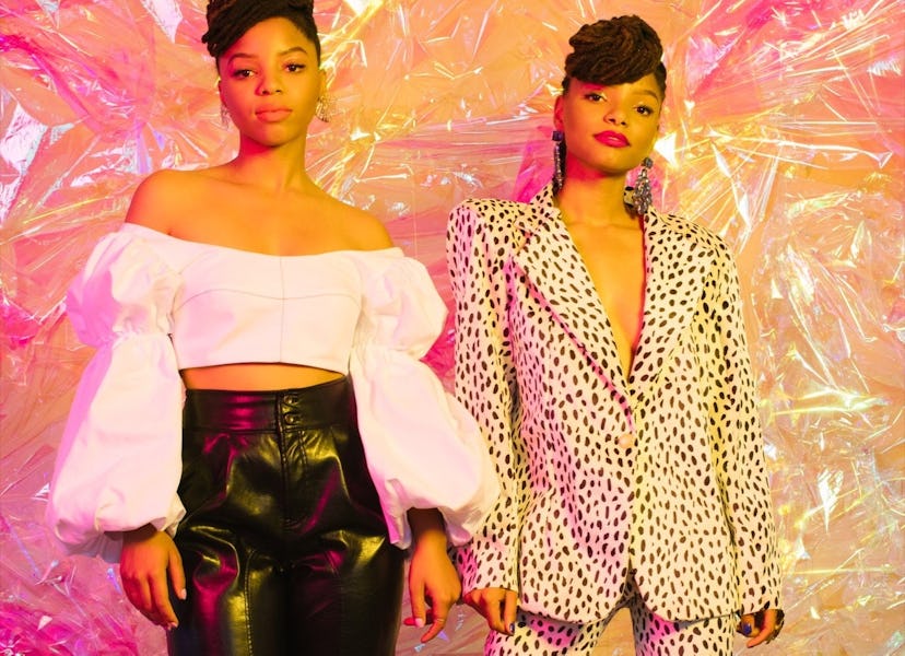 Though they play twins Sky and Jazz Forster on Freeform’s Grown-ish, and a quick glance might lead you to believe that’s the case, Chloe and Halle—known professionally as Chloe x Halle—are not, in fact, twins. At 19, Chloe is the older of the Bailey sisters; she’s a bit more gregarious with a steady spirit and a grounded laugh. Eighteen-year-old Halle is doe-eyed, prone to some moments of youthful distraction, and in possession of an effervescent voice, like someone just opened a can of lemon-lime soda. They share long, wavy, loc’d hair, a love for bold lipsticks, and that deep behind-the-skin glow achievable only by celebrities and teenagers.