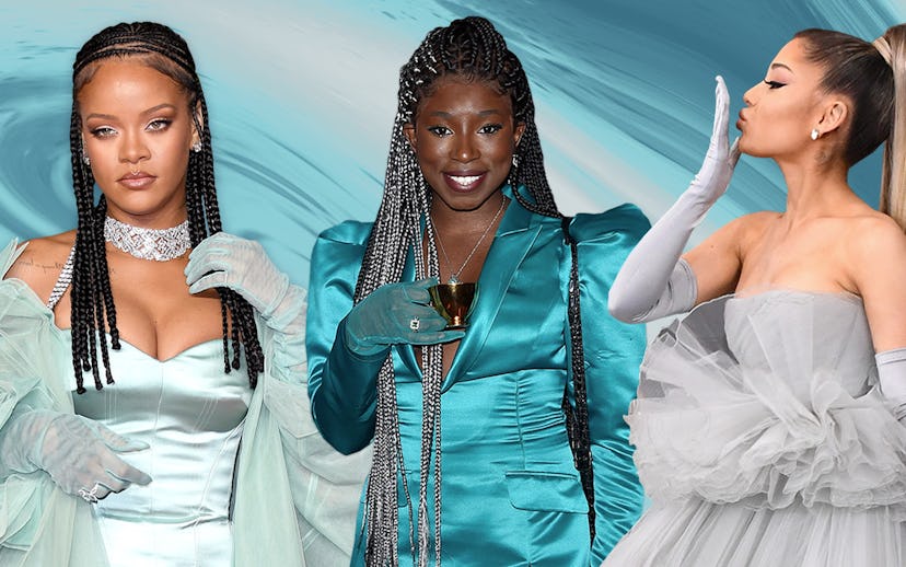 Ariana Grande accented her Giambattista Valli ballroom gown with matching past-the-elbow gloves at the 2020 Grammys. Misty Copeland opted for her own pair, too, in a sheer-but-striking green hue to complement her printed Raisa Vanessa dress. Before the awards ceremony, Teamarr wore a pair of gloves that perfectly accented her Harry Halim dress, as well as her iconic gilded teacup, which, in case you're wondering, is named "Timothea Sinclair" (with a silent "H").