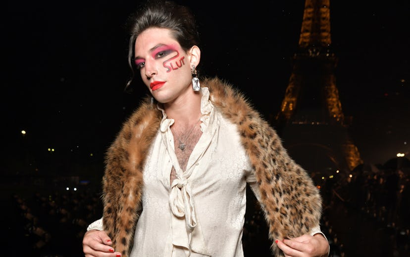 Ezra Miller Pairs "Slut" Makeup With Leopard Short Shorts For Saint Laurent Show