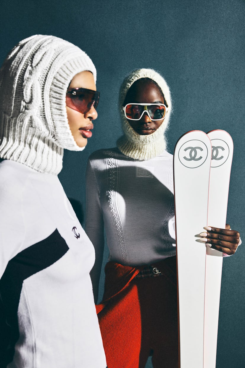 Top image credit: Left: CHANEL Coco Neige 2024 clothing and glasses, Moncler Collection balaclava; Right: CHANEL Coco Neige 2024 clothing, glasses, and belt, CHANEL skis, and Jane Wade balaclava