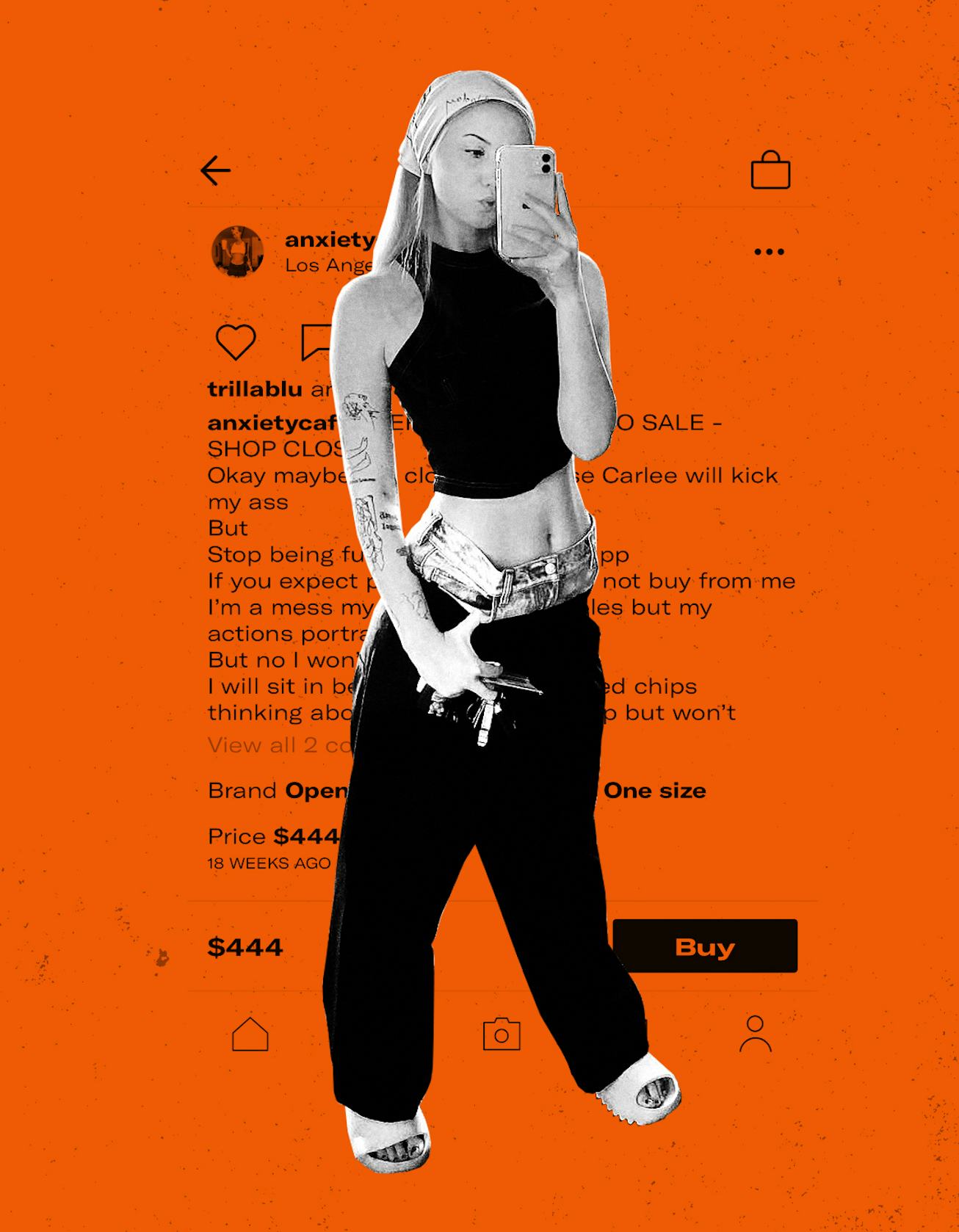 When Mika Kol duct-tapes a vintage LBD to her fridge, takes an iPhone photo with bad lighting and writes a caption about eating the rich (price: $215; timestamp: 3:26 a.m.), she’s rebelling against something, she just doesn’t know what. Hypebeast resale culture? The performativity of influencers? Expectations of femininity? In any case, Kol, 21, is aware that the Depop account where she sells her clothes does not conform to the standards of retail photography. “My account looks like a finsta. And that’s the appeal,” says Kol, known on the fashion marketplace app as @trustfundgoth.