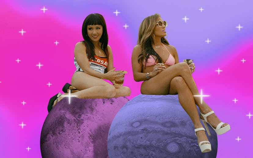 When NYLON asked me to do an astrology writeup on Hustlers, I really thought it would be about the women whose faces made up the posters for the movie. I went to the theater fully expecting to take mental notes on Destiny (Constance Wu), Ramona (Jennifer Lopez!), Annabelle (Lili Reinhart) and Mercedes (Keke Palmer). Some posters even boasted Cardi B and Lizzo, not to mention Julia "Save The Last Dance" Stiles. Surely, I surmised, there would be enough women to get at least half the zodiac covered. As someone who loves sex workers, and once bought a J.Lo tape with her middle school babysitting money, I was pumped. But, more than halfway through my popcorn and the movie reel, groaning in unison with my queer friends as Ramona and Destiny clutched each other tight, I knew what I needed to write about: the heartbreaking thwarted love between a Libra (Destiny) and a Cancer (Ramona).