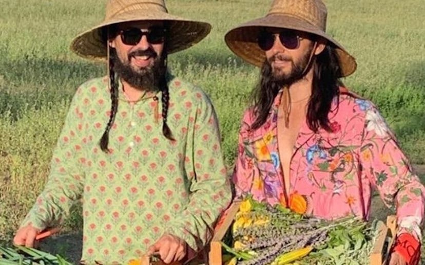 Earlier this morning, Michele posted a photo of the duo dressed quite excessively in head to Gucci, clutching crates of greens. Michele paired his printed tunic with cotton striped shorts and tube socks, while Leto sported hot pink satin joggers and the (questionable) sock-and-slide trend with his printed silk blouse. Both wore matching wide-brimmed sun hats and dark sunglasses, because everyone knows that when you're spending the day gardening, sun protection is key.