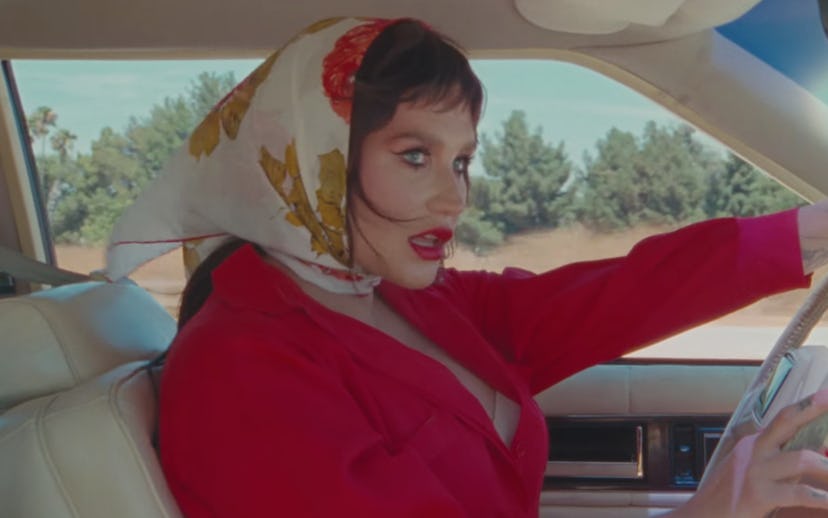 In the next scene, we see a sad and bougie Kesha walking around her home in a feathered robe. She tries to seduce her husband and he tries to choke her, so she hits him with a golden candle stick and kills him; it's all over and done in a matter of seconds. So she throws him in her trunk, dyes her hair brown, and hits the road. As she sings in the outro, "This is for the misfits of creation/ Take this as your holy validation," families watch in horror as their beloved religious leader is involved in a high speed chase with police down the highway, eventually caught wearing perfectly smudged red lipstick and her best Thelma and Louise silk scarf.
