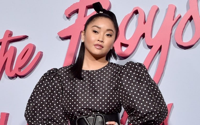 In case you haven't heard: polka dots are making a comeback this spring. Lana Condor attended the To All The Boys 2: P.S. I Still Love You premiere in Los Angeles on Monday night wearing a spotty look from Valentino's Pre-Fall 2020 collection. She cinched the dress with a chunky black "V" belt and added a bow and pearls to her hair.