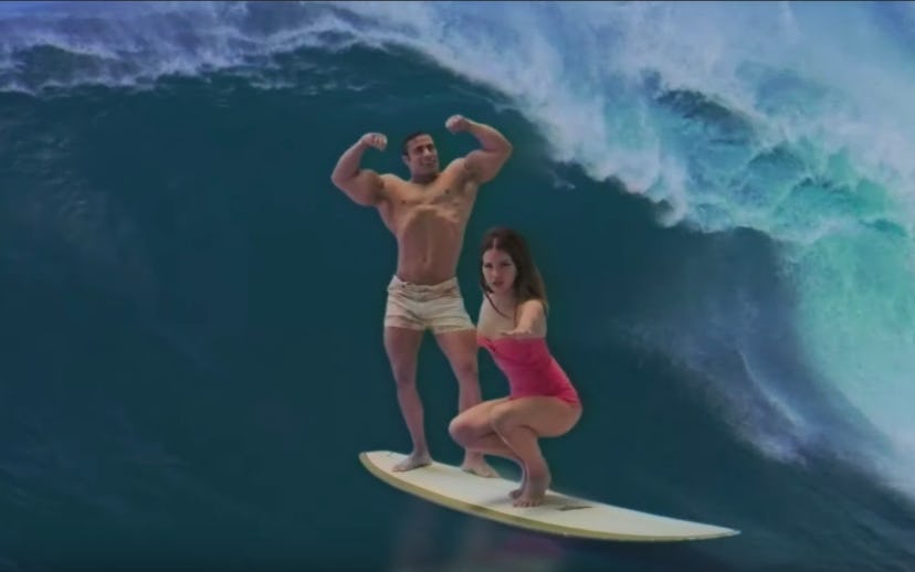 Lana Del Rey released a vintage-looking trailer for her forthcoming albumNorman Fucking Rockwell. In the beginning of the video, Del Rey fake-surfs on some green-screen waves with a male bodybuilder behind her, wearing a very '60s bouffant and makeup look with a one-piece swimsuit, as ads announcing the new album appear. After a while, the two tumble off their surfboard as the illusion breaks, leaving them on the ground in front of a film crew. Then, Del Rey is transported to an actual beach, looking very much her usual self as snippets of songs from the new album play.