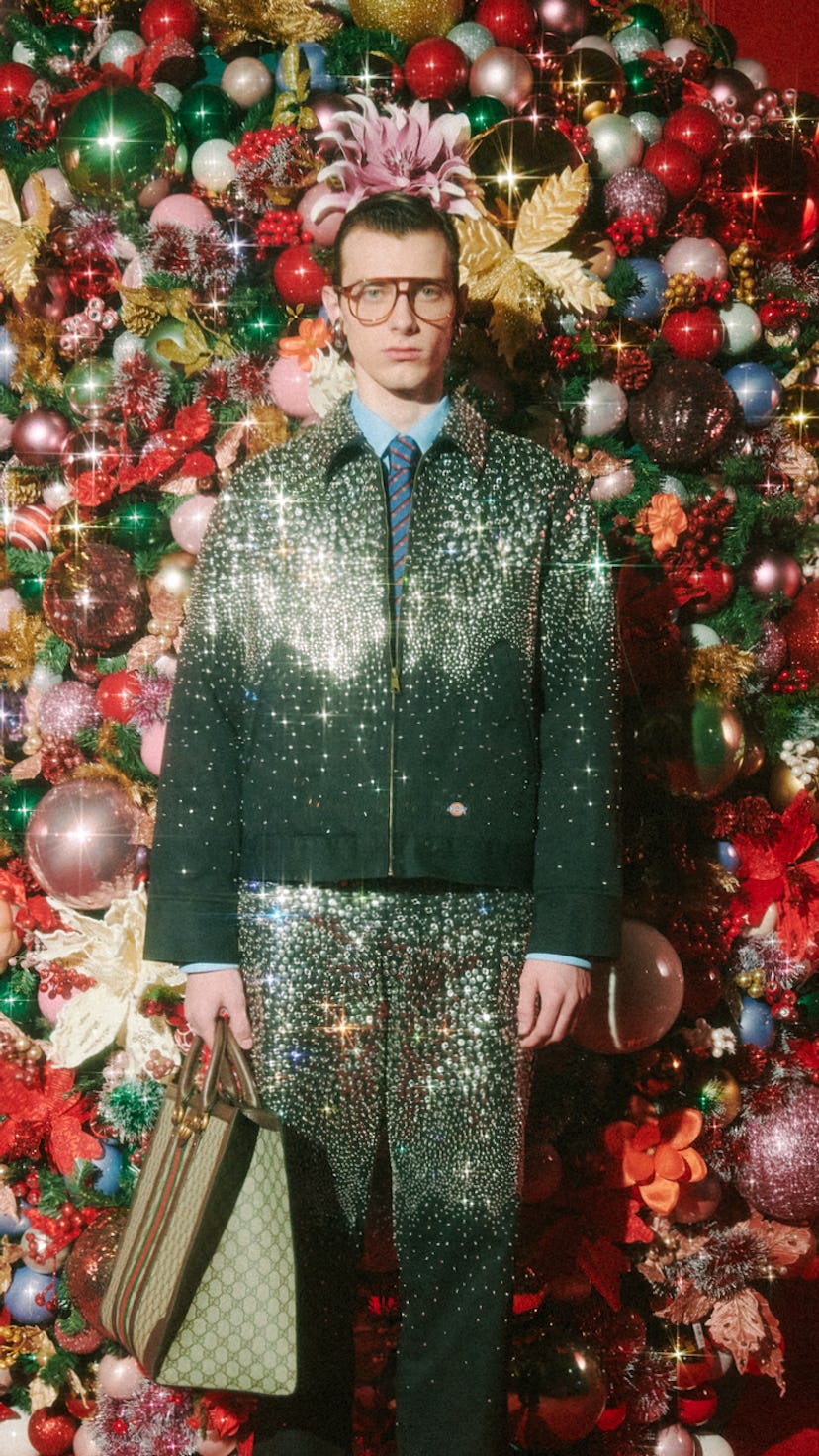 For the drool-worthy collection, which is out on the Gucci Vault today, Gucci’s artisans embellished studs by hand, grommet by grommet, to pieces like the Dickies Eisenhower Jacket ($7410) and 874 Work Pants ($6590), which both feature larger studs at the top that cascade into smaller pieces to create a crystalline, starry effect.