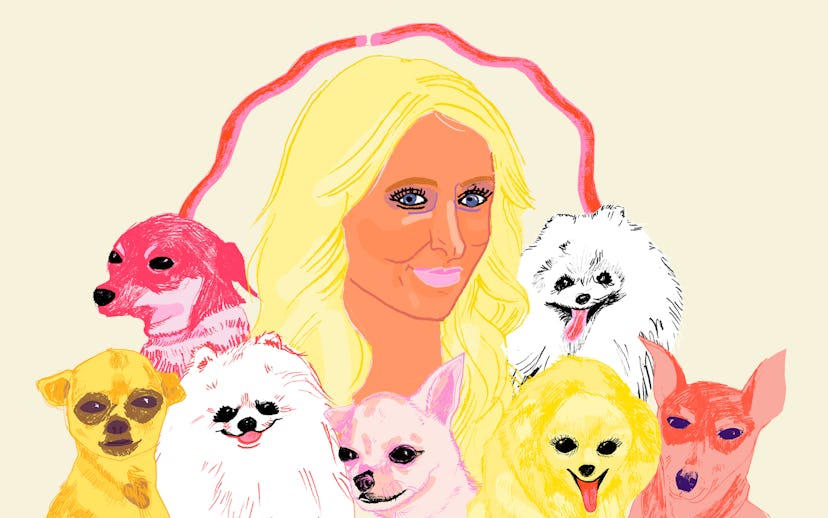 Earlier this year, Hilton, who has donated to a variety of animal rights charities, launched an Instagram account dedicated to her pets, appropriately titled hiltonpets. "We are the cutest, smartest, coolest, best-dressed pets in the world!" their bio reads. "We love our life! #Killingit." The account, and its corresponding Facebook page, typically follow the lives of Hilton's dogs—of which there are, as you can guess, many. Occasionally, her cats will make an appearance on Snapchat, but felines are fickle and hardly ham it up for the gaze of Hilton's wandering iPhone lens. No, her dogs and their 300-square-foot, Philippe Starck-furnished, Faye Resnick-decorated, air conditioned doggy mansion, located in Hilton's L.A. backyard are the true stars of Paris Hilton's not-so-simple animal life. One of them famously cost Hilton $13K; she purchased another two for $25K (one of which went to her mother). They're harder to keep up with than the Kardashians.