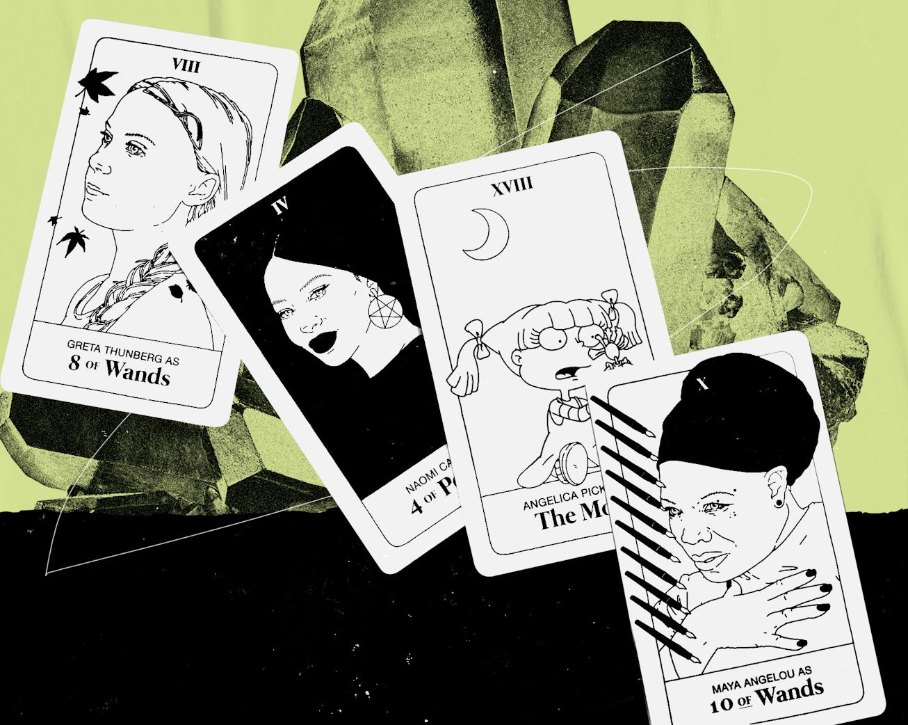 Faye Orlove, a Los Angeles-based artist and founder of the non-profit Junior High LA, created the Goddess Tarot deck by representing the meaning of the original cards through female public figures, real and fictional. Because the meanings of the cards can be abstracted from it’s imagery, she was able to then figure out who would embody each card’s story. The cards, for