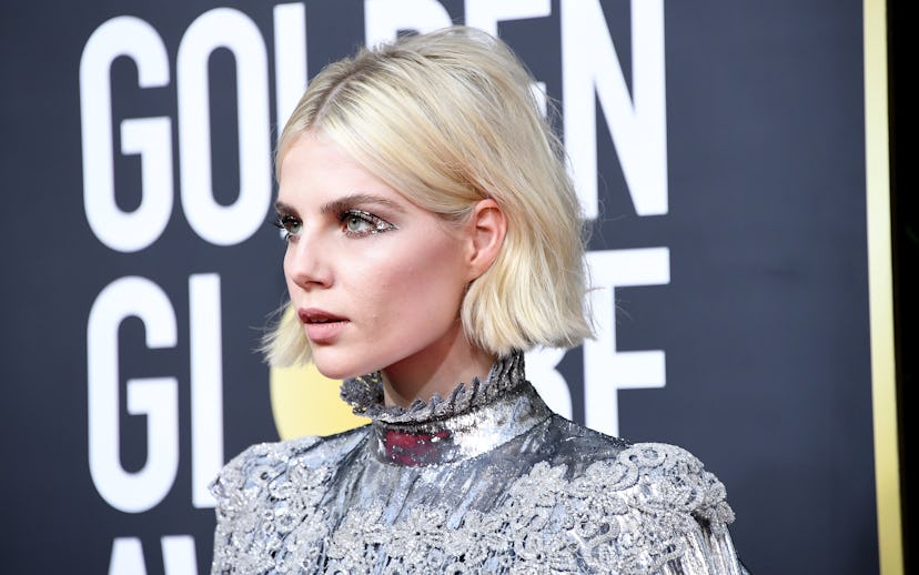 To match the energy and excitement around the nomination for Netflix breakout show The Politician, Lucy Boynton's 2020 Golden Globe makeup look went all the way out — in the very best way. The British-American actress took the red carpet — with boyfriend, Bohemian Rhapsody co-star, and nominee Rami Malek — in an otherworldly, silver custom dress by Louis Vuitton, complete with cinched sleeves, floral appliques, and a high neck. She paired the gown with a pair of simple silver sandals.