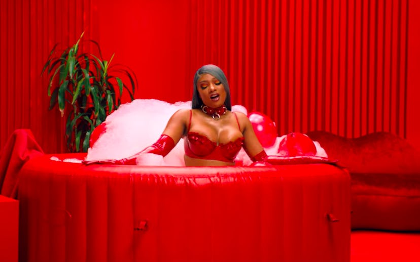 The music video sees Hot Girl Meg as an actual snack in a colorful dream world. She raps atop a colorful cake that reads FREAK in one scene. In red leather lingerie surrounded by white foam in another shot, she is your cherry on top. And she's probably the sweeter than all of the candy surrounding her in another. In true Megan fashion, the real promise of a good time comes not exclusively from undeniable sex appeal, but from the infectious fun she inspires in women around her. My favorite part is the playful booty slaps she gives her video vixens, one at a time, at the end of the video.