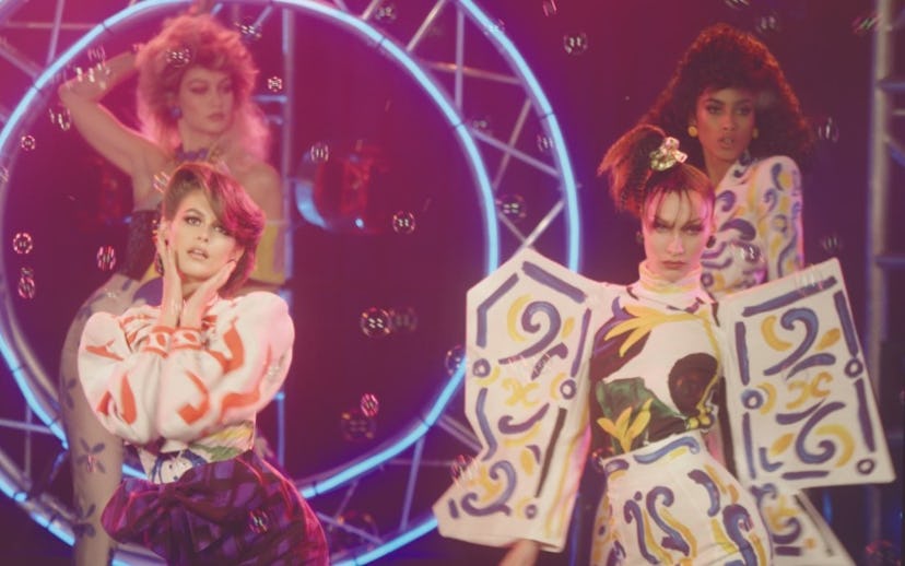 Jeremy Scott has assembled a very cool girl group for the latest Moschino campaign. Kaia Gerber, Bella Hadid, Gigi Hadid, Imaan Hammam, and Adut Akech are Moschinorama, an '80s-style new wave band performing on Top Pop Beats, hosted by none other than Tyra Banks. Bio's on the keys, Gerber's got a tambourine, and Bella Hadid does her best Bill Clinton on Arsenio Hall with the sax.