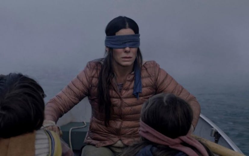 Over the weekend, it seems like everyone watched Sandra Bullock's new Netflix film, Bird Box, which is set in a world where people are forced to walk blindfolded to escape a sinister presence that makes anyone who lays eyes on it suicidal. And, since the internet exists, the film has spawned a ton of memes and one challenge that Netflix has had to advise against.