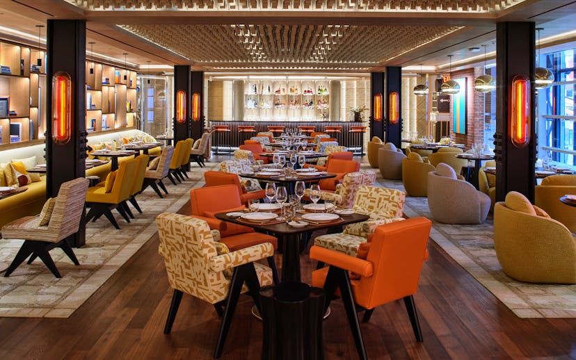 Located on the fourth floor, the temple of “luxury snacking” is lined with wall-to-wall books and sumptuously upholstered seating that really cushions the derriere — I should know, given that I stayed for the equivalent of a Parisian-length lunch at a preview event on Nov. 14. The main dining room took on the feeling of an aviary from which one could see all as guests ascended from the shiny, thumping retail floors below to do brisk business at the first U.S. location of Chocolat Maxime Frédéric, then take a load off with a glass of Champagne or a coconut cosmo. Under the many luggage tags hanging from the ceiling like a high-class wish tree and the mustachioed glower of Matty Matheson’s cookbook cover, I spooned beef tartare from organically shaped glass bowls and used a branded cloth napkin to mop up leaky sauce from the aforementioned club sandwich, cut into individual petals for the occasion. (The culinary team, led by chefs Arnaud Donckele and Mary George, outdid themselves by offering what seemed to be different hors d'oeuvres on every level; my best bite of the evening was a miniature croissant stuffed with caviar.)