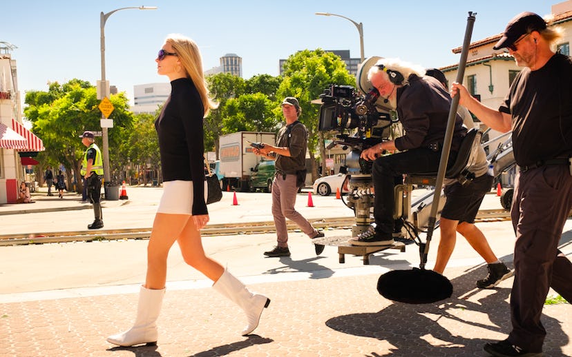 Early viewers had already commented on Margot Robbie's lack of lines, and while she doesn't have much to say, that doesn't mean we don't see her a lot in the film—and a lot of her. As Sharon Tate, Robbie smiles and dances; she gyrates in yellow short shorts and a crop top at a Playboy mansion party. We nearly see under her white mini skirt, as she struts into a movie theater to watch herself onscreen. Seated in the dark room, she kicks off her boots and puts her feet up on the chair in front of her. We stare at the soles of her feet. As with most of the women in the film, we get to know Tate most intimately through her body.