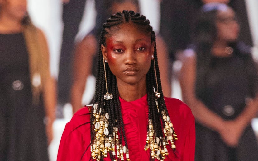 The hair room was a yellow-hued haze, evoking the familiar scents and sounds and movements of the Black salon. Beads were hand-applied, locs were retwisted, and braids freshened up. Fros were picked apart and lacefronts were laid. "We looked at hair through the ages," hair lead Jon Reyman explained of the various coifs and curls. "It was all about Black rock and roll hair." The show featured five hair looks total—ranging from wigs in slightly fuzzy pin sets to box braids embellished with thick gold jewels that bore the faces of women whom designer Kerby Jean-Raymond views as direct musical descendants of Rosetta Tharpe, the inventor of rock and roll's sound. "You have everyone from Lil' Kim to Beyoncé and Missy—Whitney Houston, and Anita Baker. We covered a lot of people," Jean-Raymond said. The jewelry feels like phase two of Jean-Raymond's injection of blackness into wearable art, following the iconic buttons he and Lena Waithe wore at this year's Met Gala.