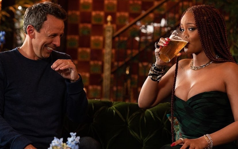 If there's any way to describe my ideal way to spend a day, it'd be day-drinking pints with Rihanna. Late-night host Seth Meyers must have been thinking the same because there's now footage on the way of the two doing just that.