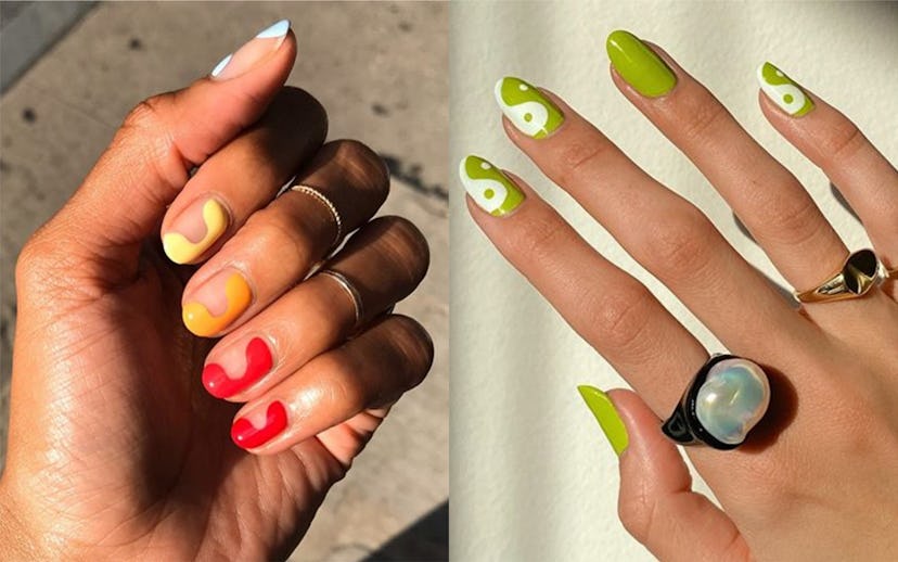 The yin & yang sign was all but made for a manicure, lending to both the curvature and multi-color nail art trends that have been dominating all of 2020. Paint each nail in the design, or leave some in solid colors to mix things up, like the manicure below.