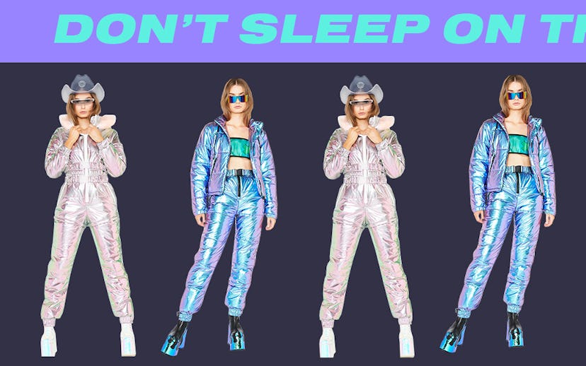 Club Exx, Aurora Beam Holographic Snow Suit, $150, available at Dolls Kill.