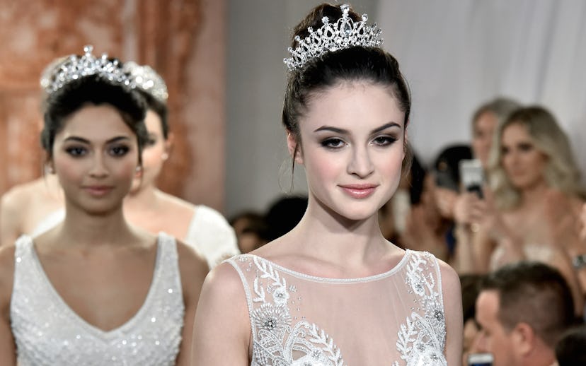 Call it the Meghan Markle effect, but the fascination with the upcoming royal wedding has reached fever pitch in all corners of the fashion industry. One need not look further than yesterday's kick-off of the biannual Bridal Fashion Week for proof, where the regal looks reigned the runways. Nowhere was it more apparent than at Theia's show. "There is a royal obsession in the air, with TV shows chronicling the fascinating lives of Queen Victoria and Queen Elizabeth, all of which is heightened as excitement builds around the upcoming nuptials of Meghan Markle," read the press release left on the chairs of the attendees.