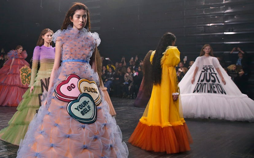 Made up of an array of colorful gowns, Viktor & Rolf's new collection featured slogans of all sorts. A white frock stated "I'm not shy I just don't like you," while another rainbow pastel creation with padded shoulders screamed "Leave me alone." Other gowns greeted smartphone-holding attendees with "No photos please," "Go fuck yourself," and "Sorry I am late I didn't want to come."