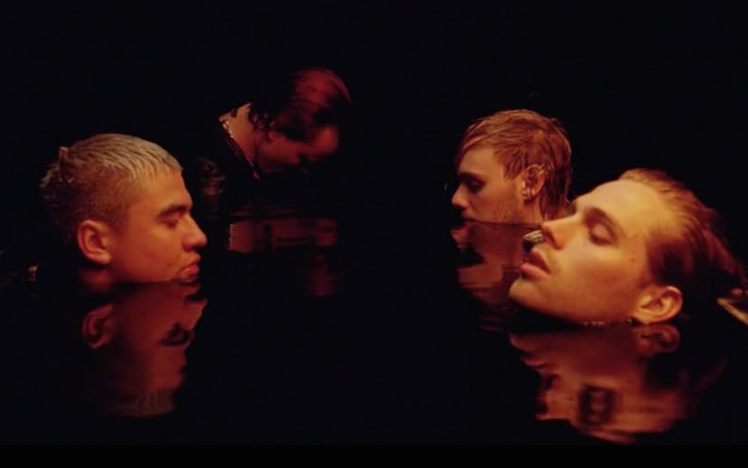 The video has a real Tumblr fan-fiction vibe, as Hemmings finds himself tied up by his wrists to the ceiling of a candlelit cave, drenched in blue lighting and just the right amount of glitter across his lids. In the first lyrics—what ends up as the catchy hook of the song—he asks, "Is it easier to stay/ Is it easier to go?" Based on the vibe I'm getting from the tattooed girl in the music video who is very untied, I'm guessing it'd be easier to go. The entire band rocks out in the cave, flashing between visuals of them nearly drowning by each others' side, and walking out of an opulent mansion as their portraits go up in flames.