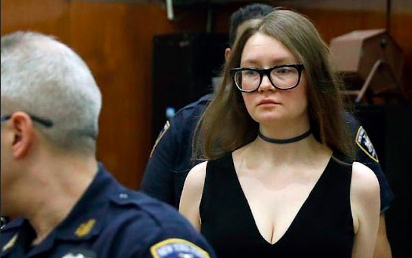 Delvey, who is accused of scamming $275,000 out of friends, banks, and businesses by pretending that she was a German heiress, showed up to court on Wednesday afternoon in an all-black ensemble: glasses with thick frames, a sleeveless v-neck dress, and a thin choker to top it off. Honestly, it's a look—and one that may solidify the choker as the scammer accessory of the moment.