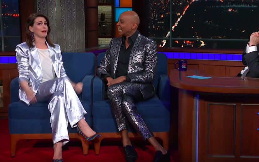 The actress was a guest on the Late Show with Stephen Colbert to promote her upcoming film, The Hustle, and the host asked what shows she likes to watch for comfort. The only program she watches that doesn't involve people dying (Game of Thrones, Killing Eve) is RuPaul's Drag Race. She admitted that she'd never met the host and probably wouldn't be able to speak if she did. Little did Hathaway know, RuPaul was in the building and ready to make Hathaway's dream come true.