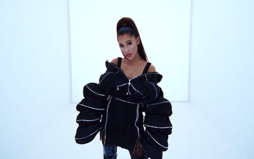 Unlike her last music video for "Monopoly," in which she was supported by her BFF Victoria Monét, Grande does all the work herself—that is, until her shoes and extensions take on a life of their own and join her as backup dancers. Her thigh-highs clack on the floor in time to the beat (which reminds me that I totally wouldn't mind if Grande ever returned to her Broadway roots with a tap dance routine), at one point multiplying to take on a kaleidoscopic shape around the singer.
