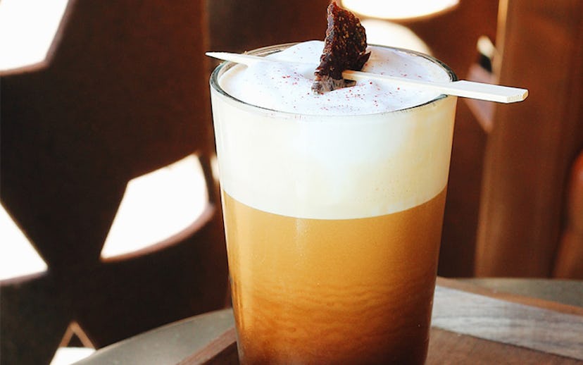 + Starbucks just announced its newest specialty drink—and it's topped with something totally unexpected: beef jerky. The coffee empire recently adopted a new roast from the Democratic Republic of the Congo, and the brew, Starbucks Reserve Eastern D.R. Congo Lake Kivu coffee, is a key ingredient. The Pepper Nitro with a Jerky Twist includes a slow-steeped cold brew served through a nitro tap and infused with a malted fennel black pepper syrup topped with a layer of honey cold foam, cracked pink peppercorn, and a bamboo skewer of beef jerky. It's available for a limited time only at Starbucks' Seattle Reserve Roastery.