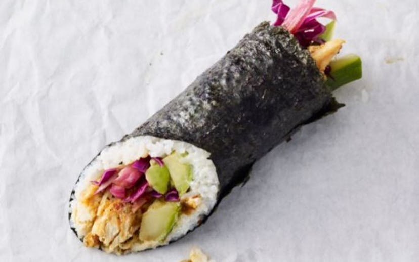 + Starbucks just announced the newest addition to its growing food menu, and it's their most surprising release yet. The chain just debuted its first-ever sushi burrito, dubbed the Chicken Maki Roll. The seaweed cocoon is filled with sushi rice, shredded chicken, cucumber, pickled cabbage, onions, and avocado with tomatillo salsa and lime crema. The addition is part of the brand's Mercato line, which also features a variety of other grab-and-go lunch items, from soups and sandwiches to small dessert pots. The catch? The Mercato line is only available at select Starbucks stores in Chicago and Seattle.