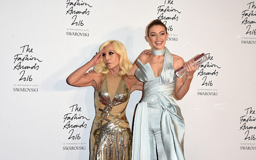 + Gigi Hadid went au naturel for the latest Versace campaign. The flashy spread features the supermodel in nothing but a pair of black stilettos, lounging on a canopy bed, with gold embroidered pillows surrounding her. Cozy girl swag.