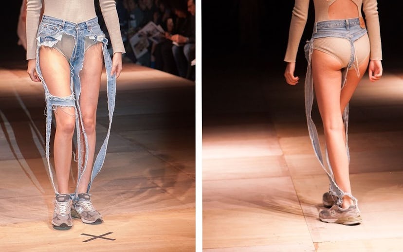 + Things are going down at Tokyo Fashion Week—and the most newsworthy thing to come out of it so far are thong jeans. Yes, you read that correctly. Thibaut put a model down the runway in a pair of jeans consisting of seams, and basically nothing else. The pants, if you can even call them that, were worn tucked into a pair of New Balance sneakers that we definitely wore as kids. Just looking at this gives us phantom pains of inner thigh chafing. Whether you consider this to be a ~look~ or not, we can probably all agree that we are truly living in an age of innovation.
