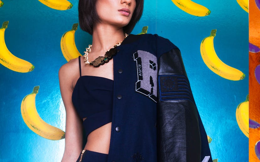 Two-Piece Dress, $199, Fame & Partners. Jacket, $130, Reason Clothing. Necklace, $58, Melody Ehsani. Flavor Paper, B-A-N-A-N-A-S, Michael Angelo.